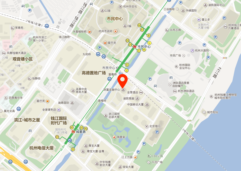 周边信息 酒店 杭州钱江新城美居酒店、全季酒店(钱江新城店)、全季酒店(新城市民中心店)、桔子水晶杭州钱江新城酒店、亚朵酒店(杭州钱江新城店)、杭州钱江新城禧玥酒店、杭州洲际酒店、杭州泛海钓鱼台酒店、杭州钱江新城万怡酒店、浙江鑫怡酒店(钱江新城店)、杭州风雅钱塘大酒店(杭州四季青店)、铂曼酒店(杭州钱江新城店)。 美食 南堤·中餐厅、奎元馆(市民中心店)、知味观卤味外卖(市民中心店)、香港翠园茶餐厅(迪凯银座店)、7017味道工厂(钱江新城店)、把愚酸菜鱼(解放东路店)、肯德基(砂之船奥莱店)、麦当劳(杭州迪凯银座店)、大江东麻辣香锅、食悦湾、粤顺顺德特色餐厅(迪凯城星国际店)、富春舫私房菜、回味大饭堂。 银行 中国建设银行(杭州钱江新城支行)、杭州联合银行(上城区支行)、澳门国际银行(杭州分行)、华夏银行(杭州分行营业部)、中信银行(杭州分行)、北京银行(杭州分行营业部)、招商银行(杭州分行)、中国农业银行(杭州市民街支行)、杭州银行(市民中心支行)、台州银行(杭州分行)、上海银行(杭州分行)。 购物 砂之船奥特莱斯广场(解放东路店)、杭州华润万象城、杭州来福士中心、天虹商场(杭州购物中心)、银泰百货(杭州庆春店)、万泰城、杭州大厦501城市广场。 超市 乐巴扎超市(杭州高德置地店)、联合润农超市(市民中心店)、联华超市(杭州静安花苑店)、全家便利店(解放东路店)、世纪联华(汉嘉国际店)、7-ELEVEn(杭州店)、杭州华润万象城。 学校 浙江省杭州四季青中学、采荷实验学校、钱江新城实验学校、杭州市崇文实验学校、杭州市开元中学、杭州市采荷中学、杭州天地实验小学。 医院 浙江大学医学院附属邵逸夫医院(庆春院区)、杭州市妇产科医院、浙江康复医院、杭州市第三人民医院、浙江大学医学院附属第二医院(滨江院区)。 部分入驻企业 杭州友荐金融信息服务有限公司、杭州纳永实业有限公司、杭州融坚商务信息咨询有限公司、杭州房益融信息科技有限公司、杭州北佳企业咨询有限公司、杭州房云融商务咨询有限公司 ... ...